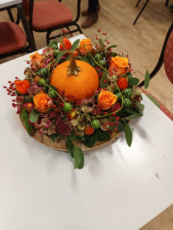 Een krans van gaas op een houten onderbord werd gevuld met oase. De krans werd opgevuld met blad, ecalyptus, hortensia, appeltjes etc. etc. In het midden een oranje pompoen.
