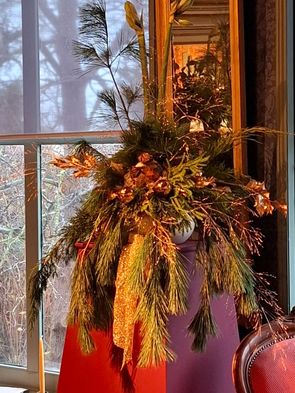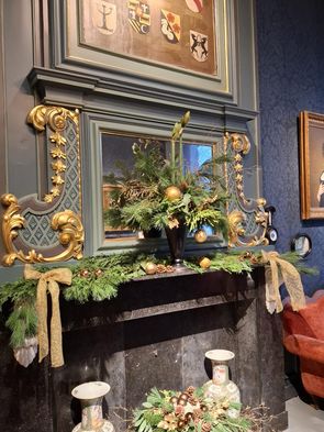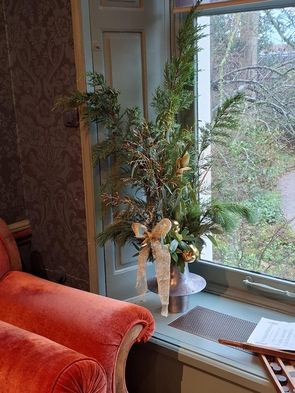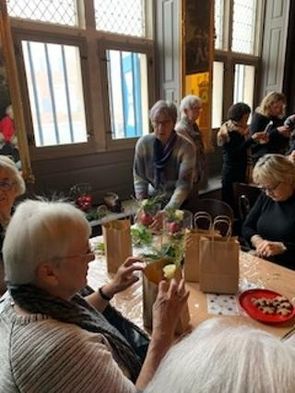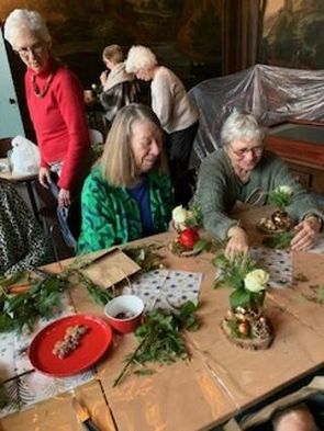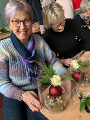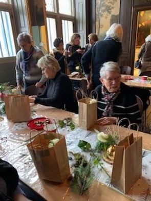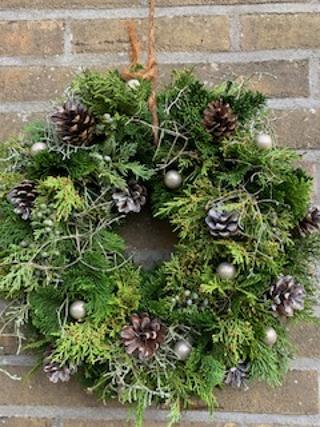 Bij mij( bestuurslid Geertje) hangt de krans nu naast de deur en is versierd met kleine kerstballetjes, dennenappeltjes