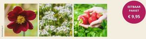 Een mooie én smakelijke combinatie voor de tuin: bloemen, kruiden en fruit in één pakket. De bloemblaadjes van de dieprode dahlia smaken licht peperig, met een vleugje chocolade. Knoflookbieslook geeft de hele zomer een subtiele smaak, en de aardbeien zorgen voor een zoete oogst. Zo verbind je sierwaarde en eetplezier moeiteloos met elkaar.